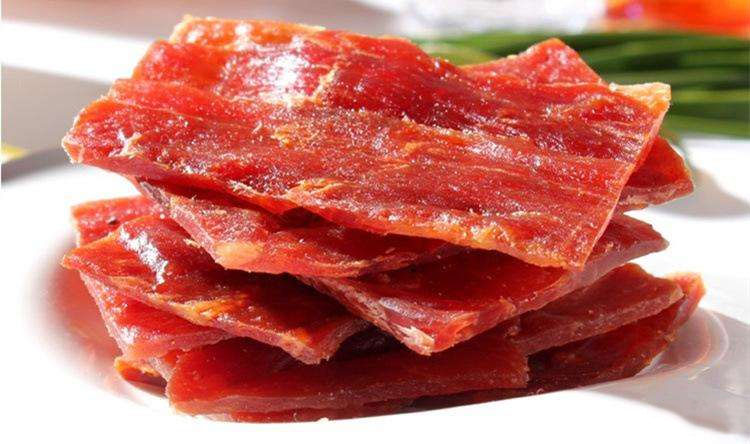 豬肉烘干:烘干的目的主要是促進發(fā)色和脫水熟化。將鋪平在篩子上的已連成一大張的肉片放入烘干房中,烘干的溫度在55~60℃,前期烘干溫度可稍高。